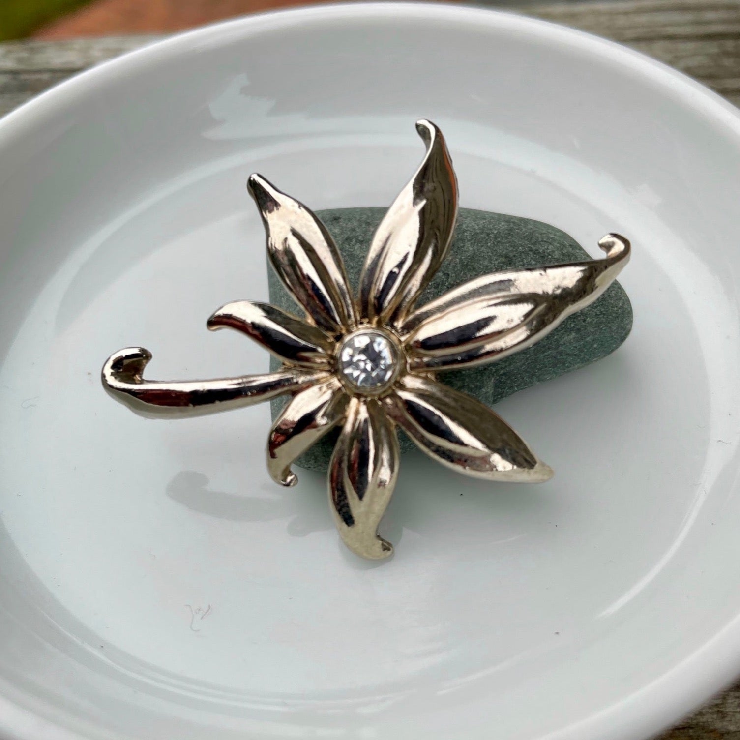 Vintage 2" Bright Flower Brooch with Center Clear Gem Modern Metal Pin