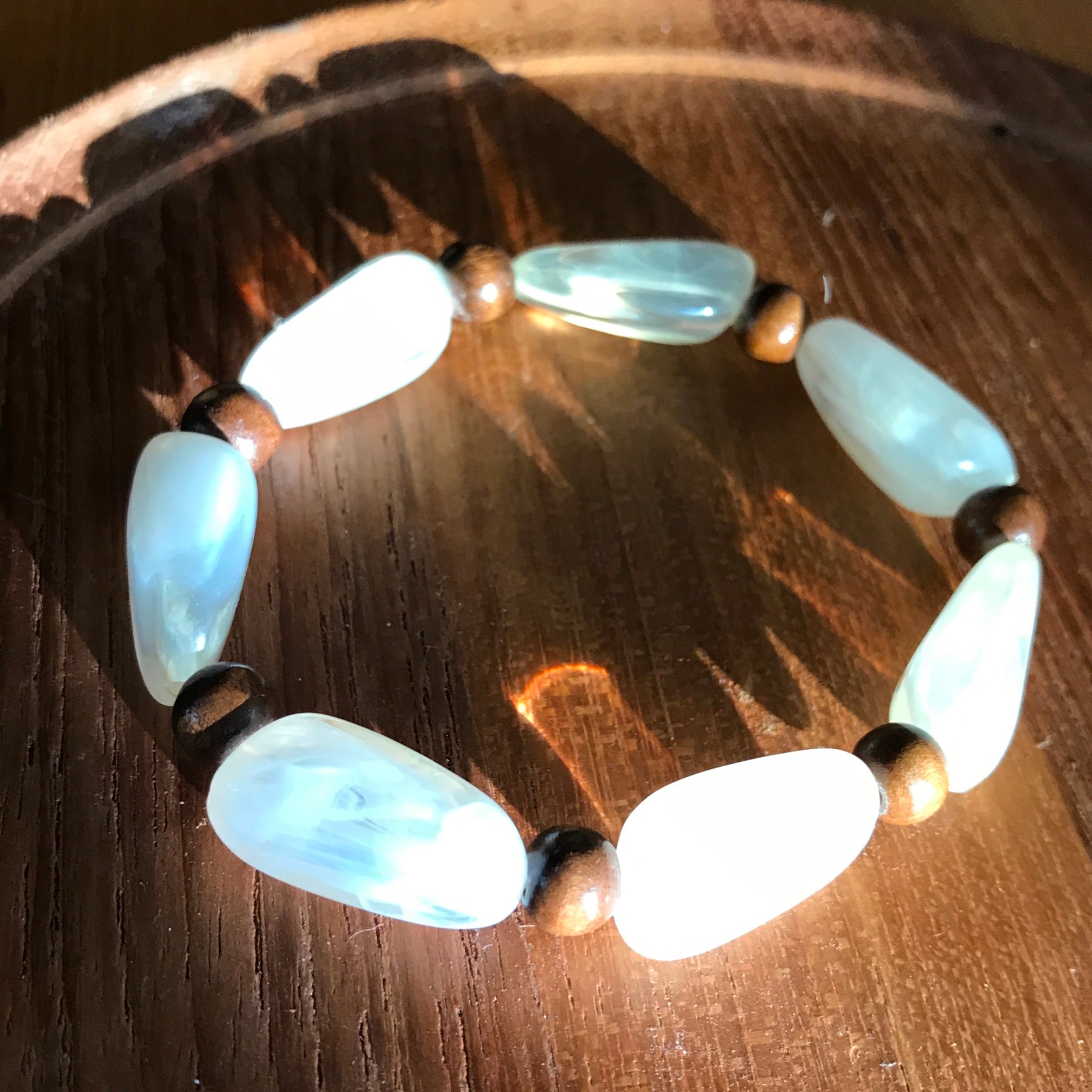 7" Clear Acrylic & White Swirl Lucite Beads & Wood Stretch Bracelet Vintage